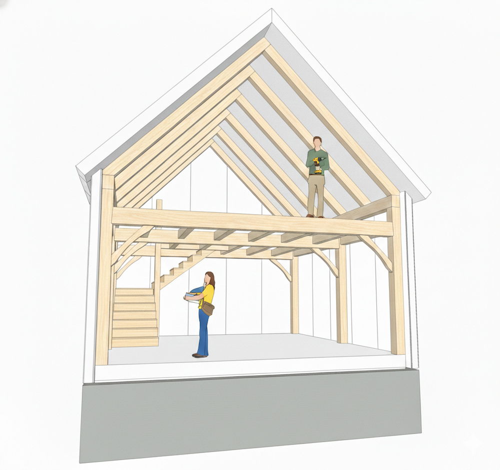 The Boothbay Cottage is a handcrafted timber frame kit designed as a high-utility small home. Built as a vacation retreat near Boothbay Harbor, Maine, this efficient 1.5-story design provides a spacious second-floor bedroom while maintaining a full kitchen, living area, and bathroom on the main level. The Boothbay is engineered to accommodate code-compliant stairs, offering safe and easy access to the upper level for year-round living. Enclosed in a high-performance SIP envelope, it provides a bright, energy-efficient sanctuary in a classic New England style.