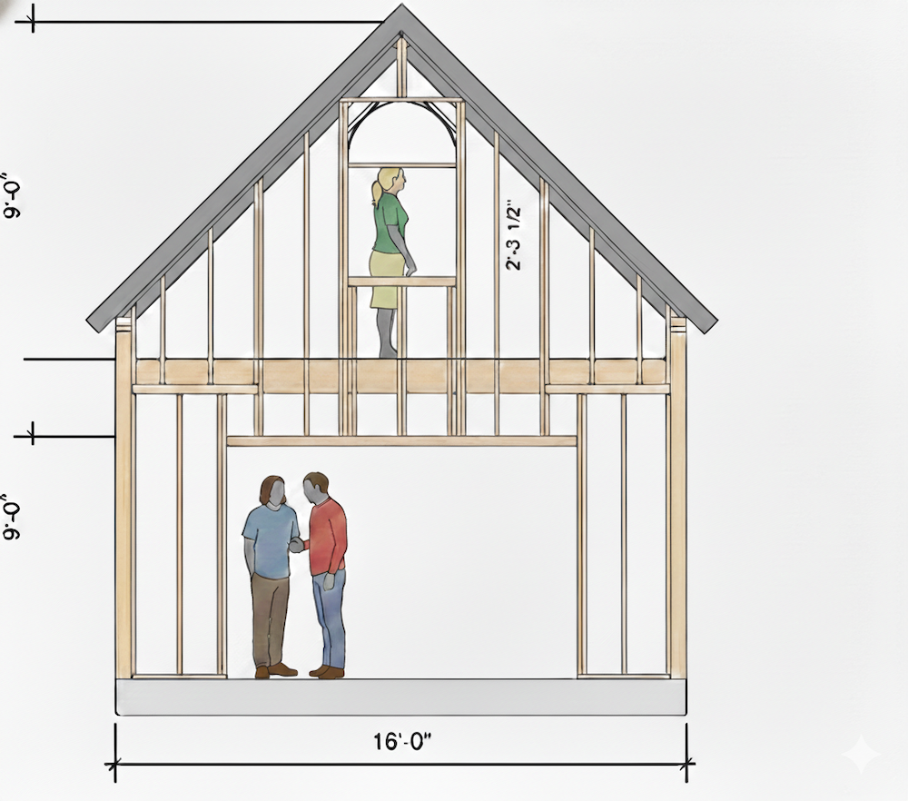 This structure is big enough to have a standard, code-compliant staircase and provide a bedroom on the second floor. With spacious floor layout, taller wall panels, and heavy timber beams, The Madison offers more loft headroom and cathedral ceiling to the peak. This building was assembled in 7 days on site including siding, window and door installation, and full metal roofing. The PANEL FRAME wall system is left open for clients to install wiring and utilities prior to insulating and installing interior wall surfaces. The SIP roof over timber rafters is complete with sheetrock ceiling ready for taping and mudding.
