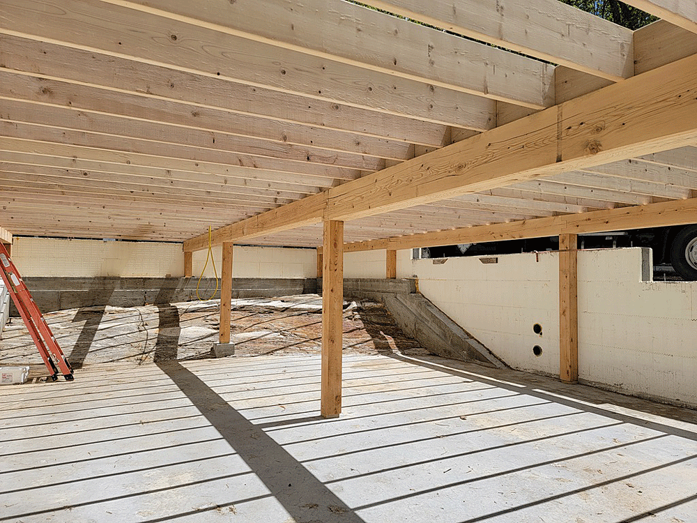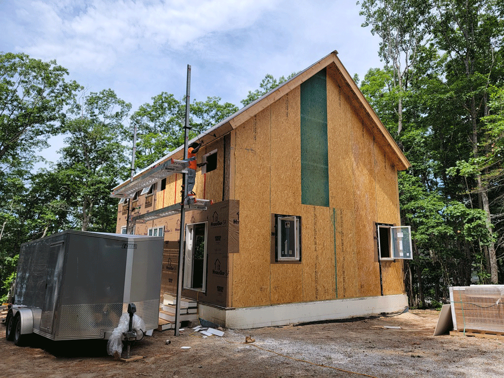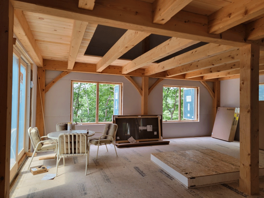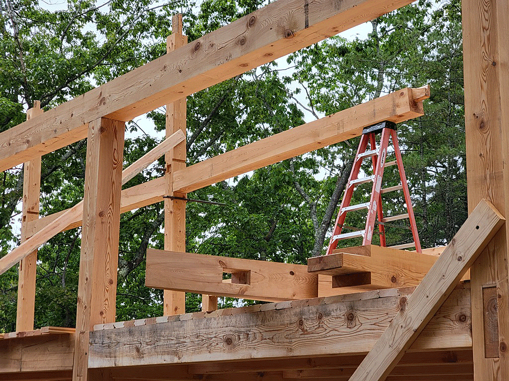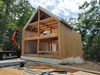 We designed and built this 2,000s.f. timber frame structure for clients interested in a second home on the coast of Maine. This design has an open cathedral space, expansive windows, and a third floor attic area for storage. There is a first floor bedroom and full bath and another bedroom/bath upstairs. The full daylight basement provides additional living space and the possibility of a workshop with a view.